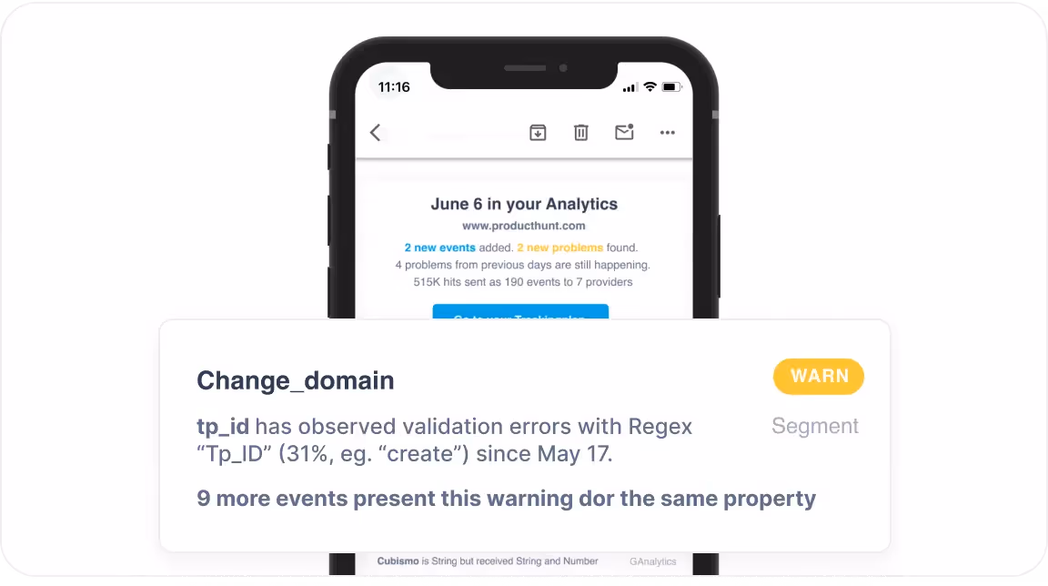 Be instantly alerted whenever unexpected properties sneak into your events with instant warnings for out-of-spec properties.