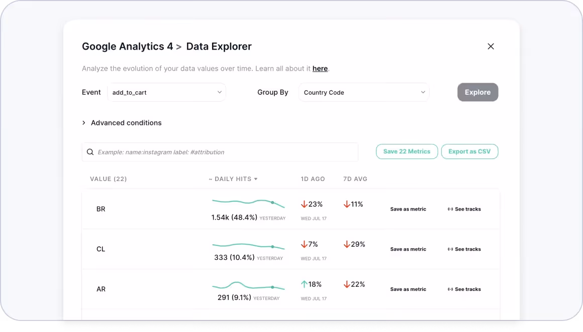 Filter traffic by country, track users who aren't logged in, or apply any wild condition you can imagine! With Trackingplan’s Events Data Explorer, you can now view event traffic with advanced filtering options to gain deeper insights and answer specific questions with ease.