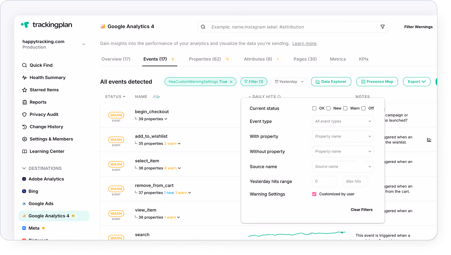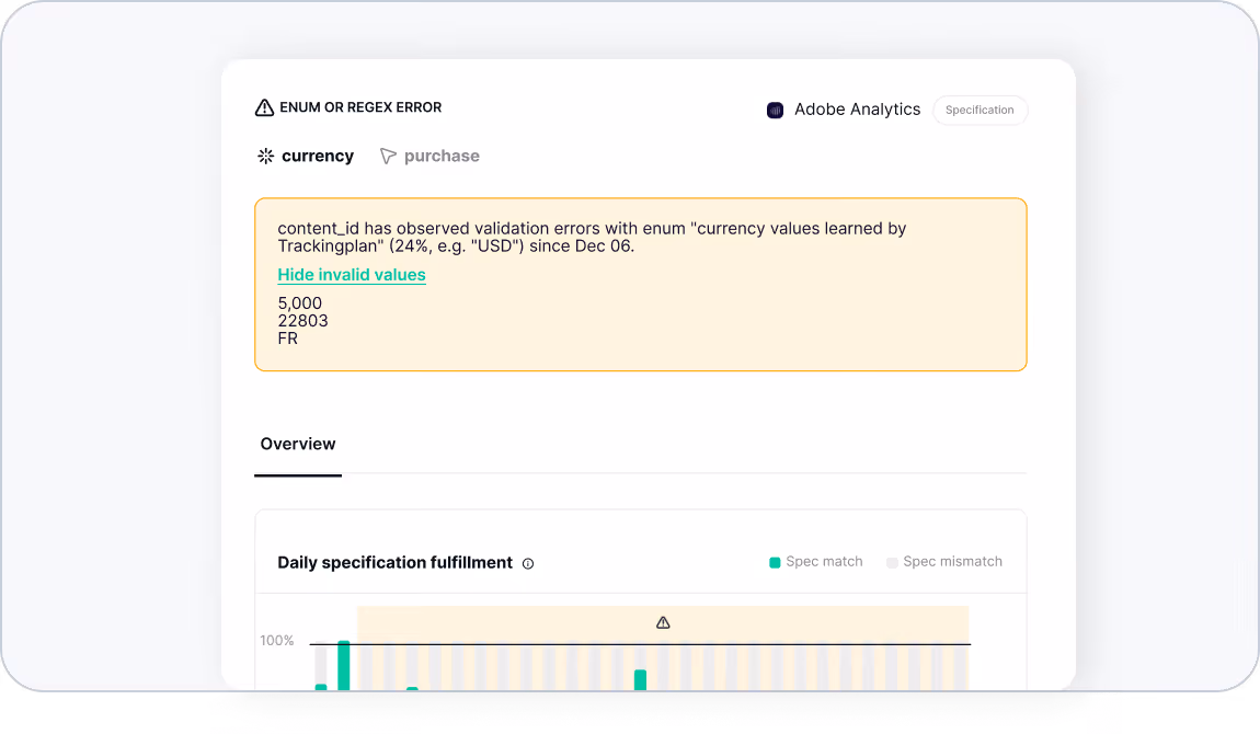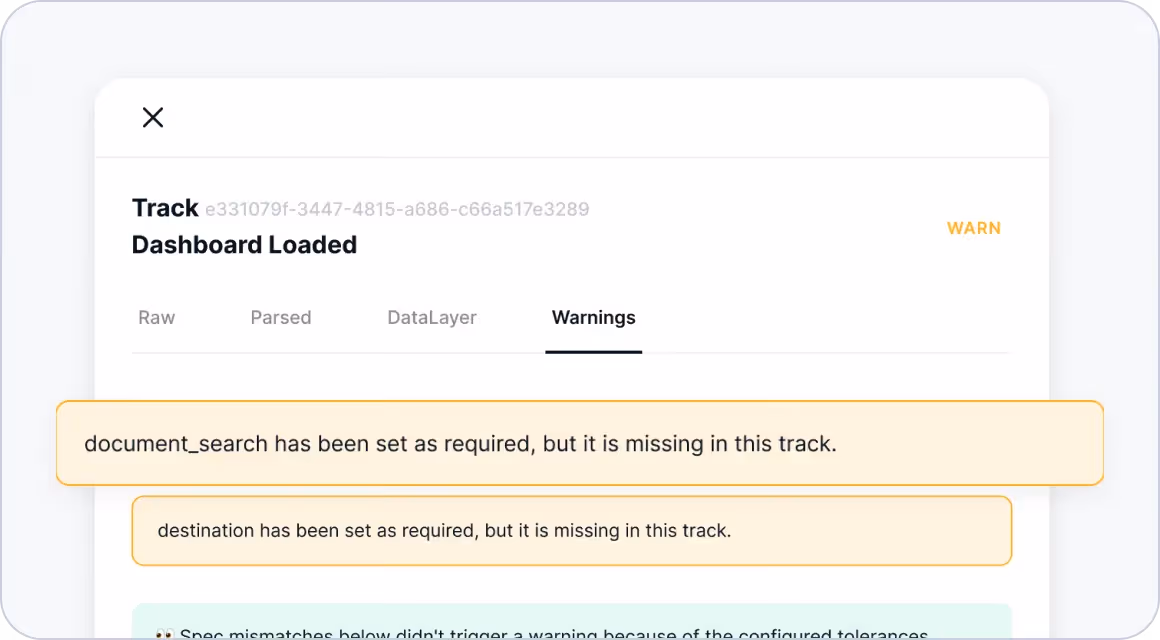 Trackingplan automatically applies event and property specifications based on the recommendations from your Analytics and Marketing tools, providing early specification warnings to help you quickly correct discrepancies and maintain high data quality standards.
