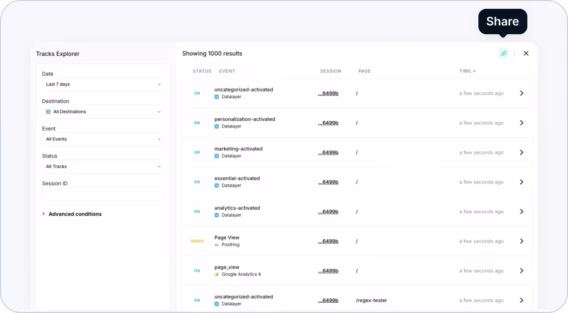 Be provided with a comprehensive view of all your tracks in raw, parsed, and data layer format without the need to download them, allowing you to see in real time what has been sent to your servers and analytics providers.