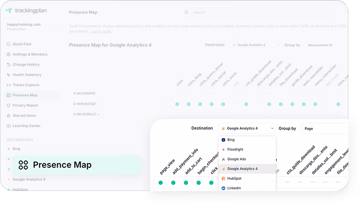 Trackingplan's Presence Map provides a clear, visual interface to help you ensure that all your events, pixels, and Data Layer values are consistently tracked across pages, UTMs, consent settings, and key attributions.