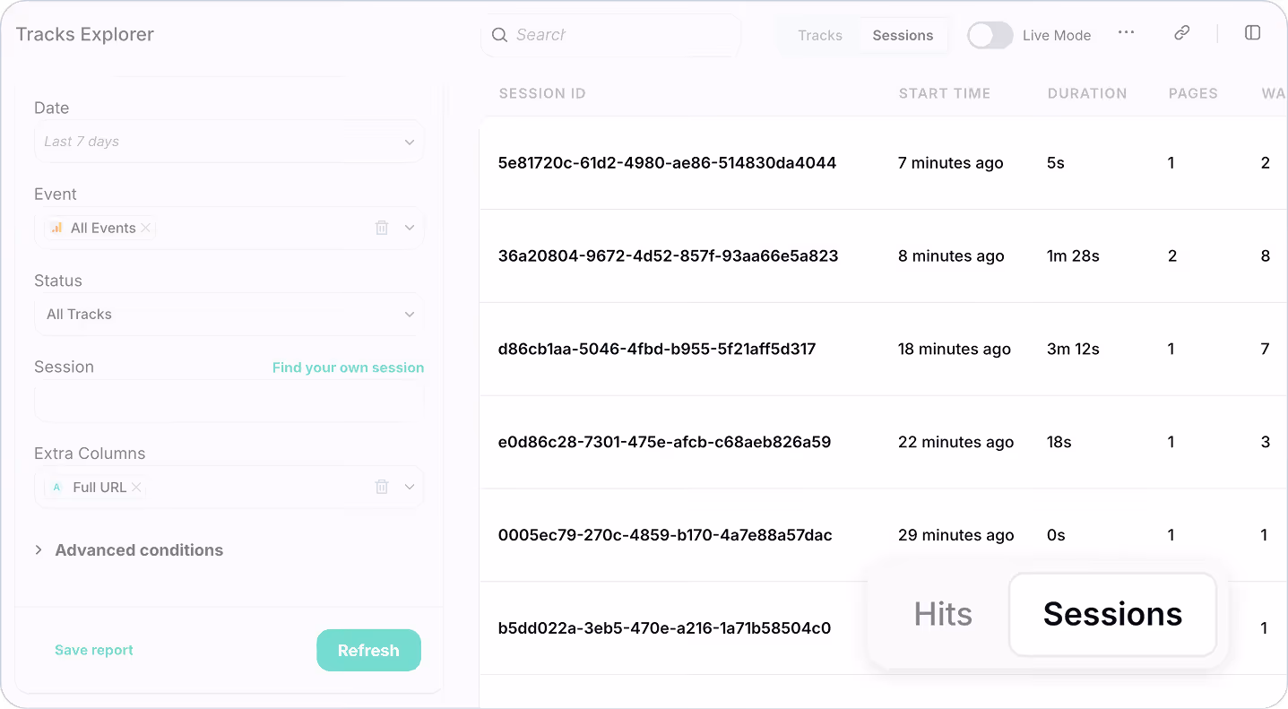Now, analyzing event trends is easier than ever! With our new date selector, you can view total event hits over the last 14 days with a clear timeline and filter sessions by a specific date in your Tracks Explorer.