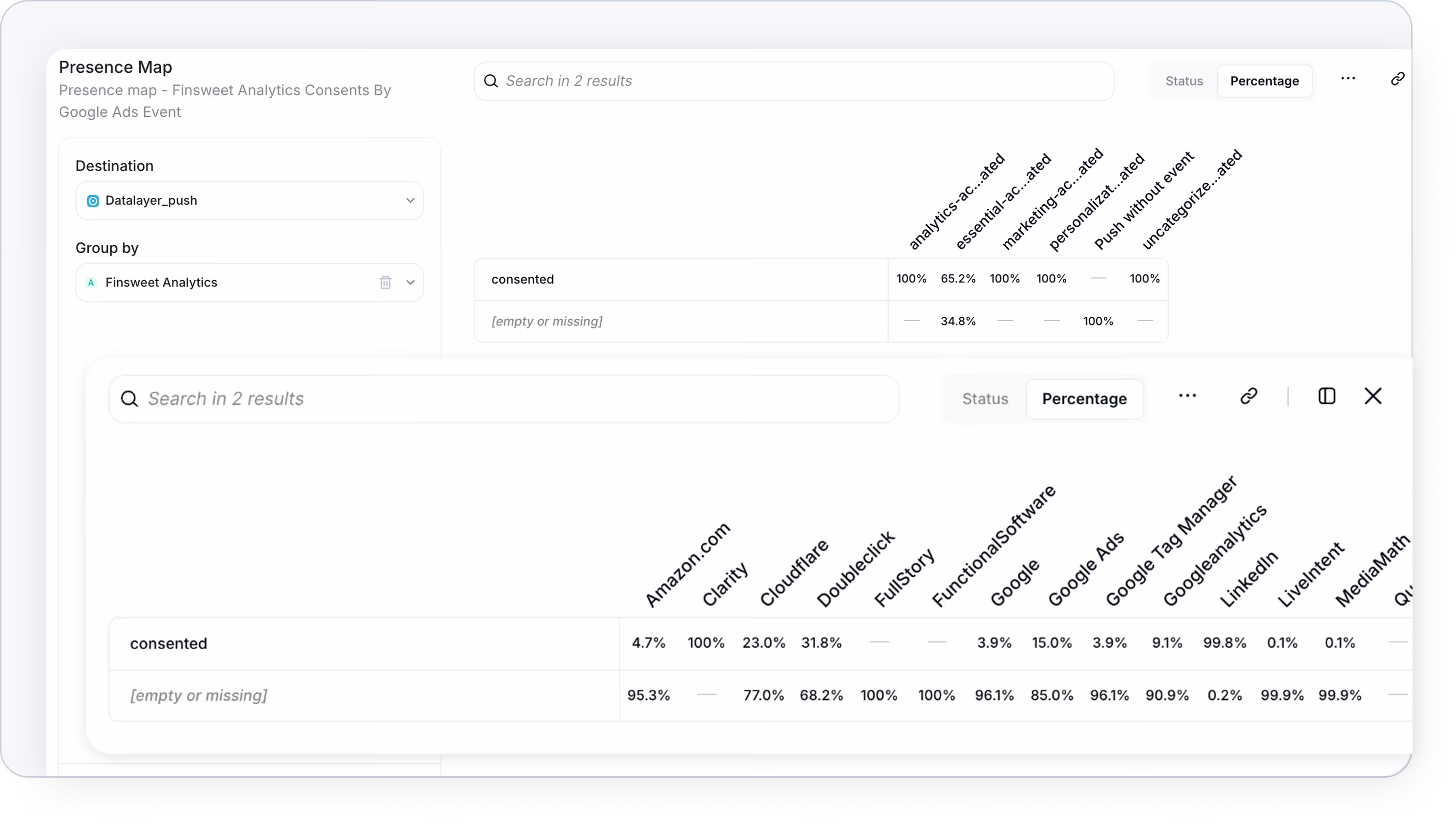 Trackingplan Presence Map now includes percentages to help you instantly understand where and how your events, pixels, consent settings, and DataLayer values are being tracked across platforms.