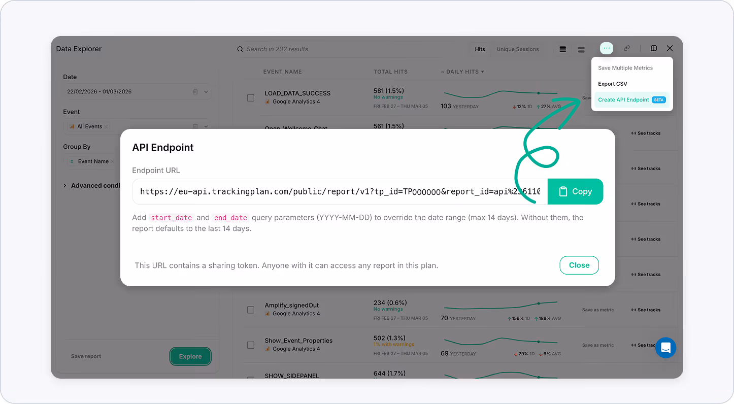 Trackingplan has introduced a new API endpoint that gives you real-time access to your monitoring data directly from Trackingplan’s data exploration views.