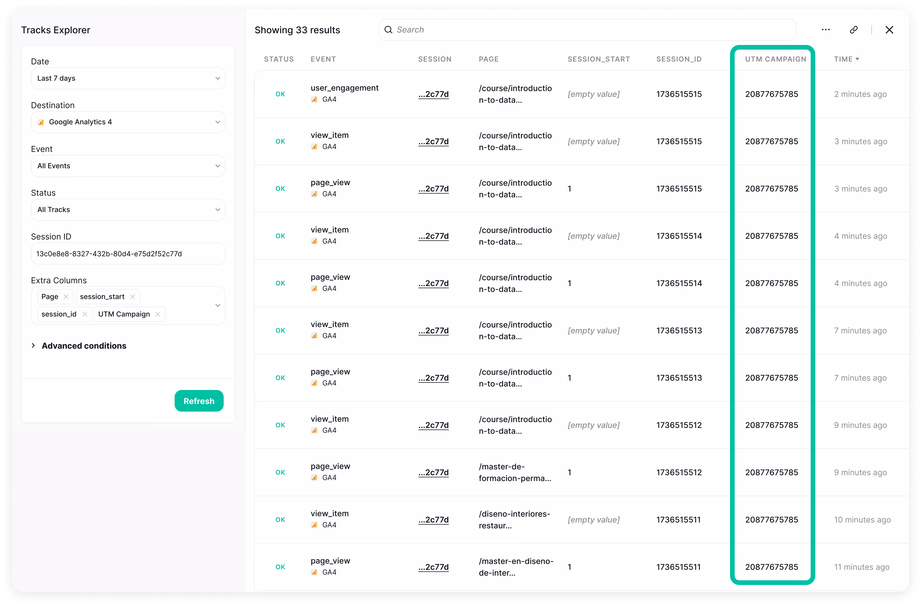 Next, we’ll add parameters like session start and session ID to customize the view and gain a clearer understanding of how these properties are behaving. Additionally, as Trackingplan gives us the flexibility to choose from a wide range of attributions, UTMs, consent options, DataLayer values, and more – allowing us to analyze each event across a user’s journey or session based on multiple parameters– we’ll also include the UTM campaign parameter, to be provided of deeper insights into campaign performance.