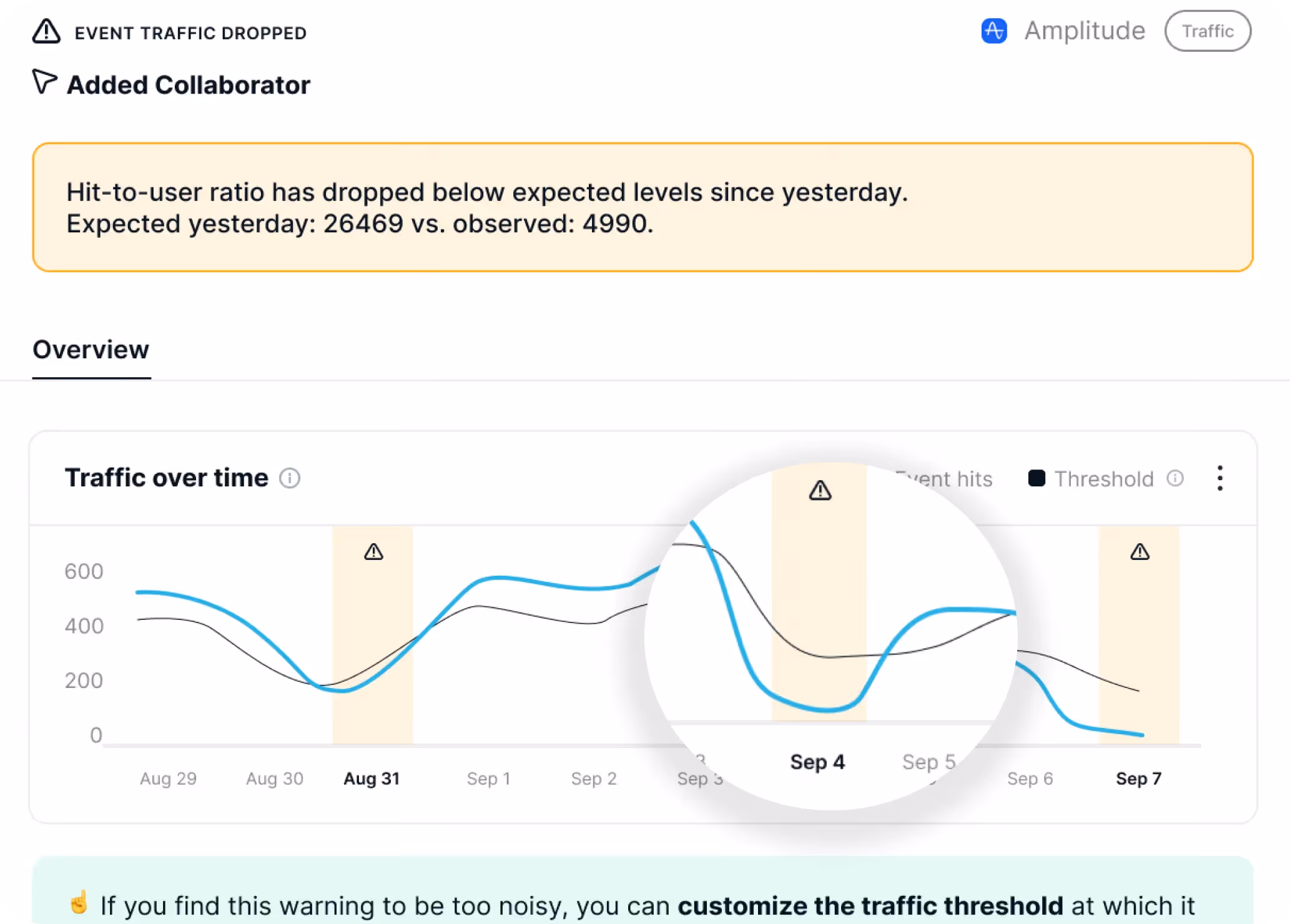 Our traffic anomaly detection algorithm now extends its coverage to traffic drops and events with few hits, without requiring any minimum threshold at all. It automatically adjusts to the high variability typically observed in sporadic events, allowing you to detect anomalous user behavior across all your events.