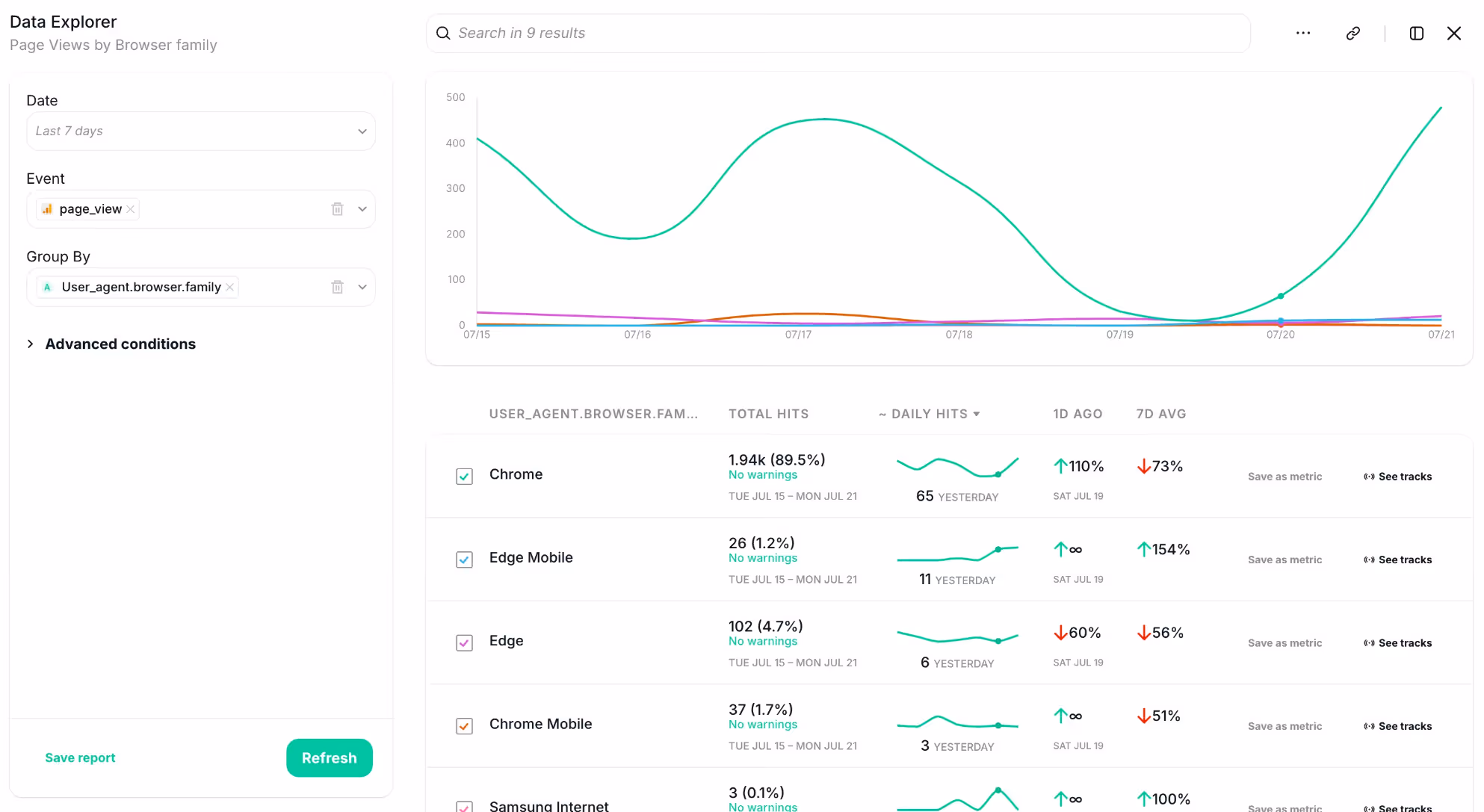 Understand how users experience your site across different browsers and spot tracking anomalies.