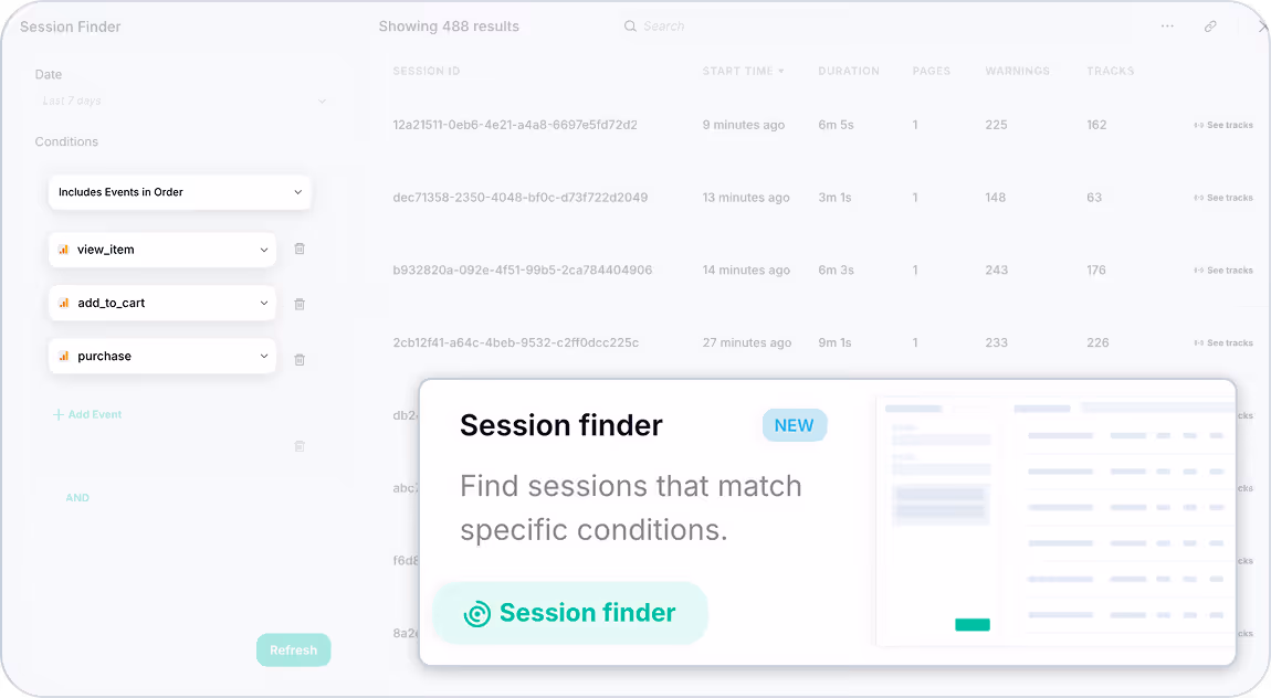 - Investigate broken funnels: Spot sessions that reached critical pages (like the thank you page) but are missing essential conversion events (purchase).