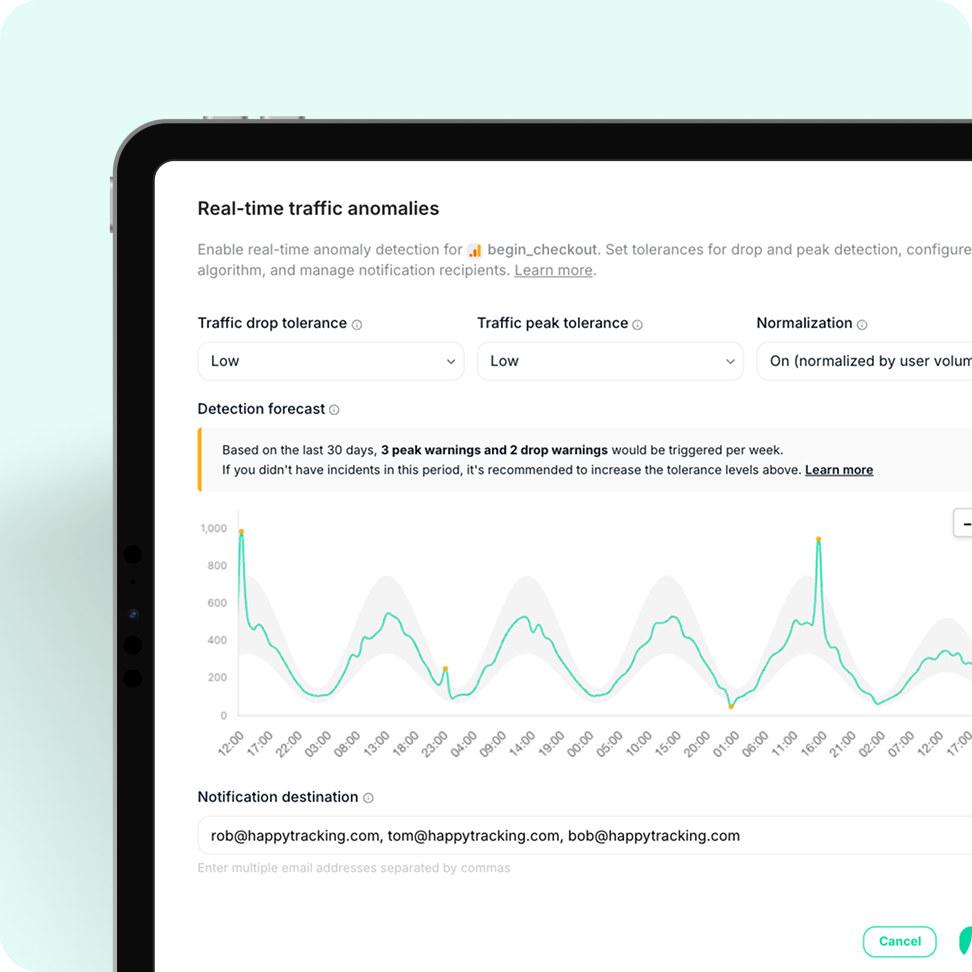 Monitor events, SDKs, and tracking behavior across iOS, Android, and backend traffic — with the same visibility and alerts you have on web.